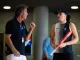 Dwie kobiety siedzą na ławce przy korcie tenisowym, jedna z nich jest ubrana w fioletową koszulkę i niebieską czapkę oraz trzyma rakietę tenisową, druga ma głowę schowaną w dłoniach, obie wyglądają na zamyślone lub zmartwione.