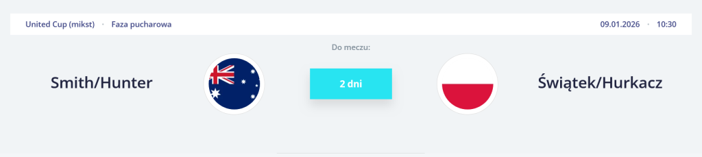 9 stycznia w ćwierćfinale United Cup 2026 w Sydney polski duet Iga Świątek i Hubert Hurkacz zmierzy się w mikście z parą Storm Hunter/John-Patrick Smith z Australii po singlowych spotkaniach z Mayą Joint i Aleksem de Minaurem. To ważny sprawdzian dla Biało-Czerwonych, którzy po pewnych zwycięstwach w grupie awansowali do najlepszej ósemki turnieju drużynowego otwierającego sezon tenisowy. Polacy, dwukrotni finaliści United Cup, będą chcieli się przełamać i wykorzystać formę przed nadchodzącym Australian Open. Zapraszamy na relację na żywo.